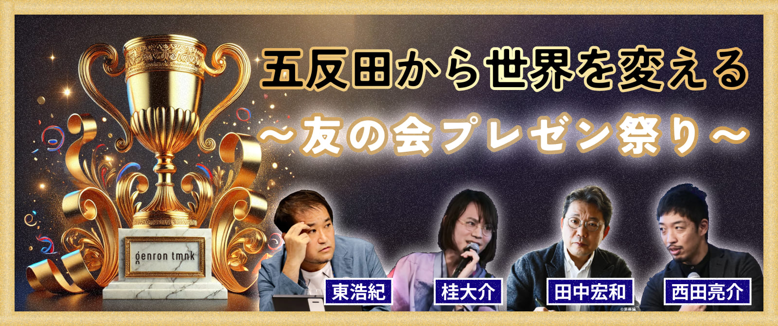 コンテストではプレゼン・質疑応答を行ったのちに最優秀賞を決定。審査員は259人のタナカヒロカズさんを集める「田中宏和の会」代表理事の田中宏和さん、社会学者の西田亮介さん、シラスCTOの桂大介さんに、東浩紀を加えた4名。最優秀賞には多額の賞金をご用意──というわけにはいきませんが、多種多様な業種の会員がいるゲンロン友の会。プレゼンが好評なら、本当に出資者や共同研究者が現れるかもしれません。ゲンロンのコミュニティを母体に、新たなビジネスや社会実験が生まれるとよいと考えています。