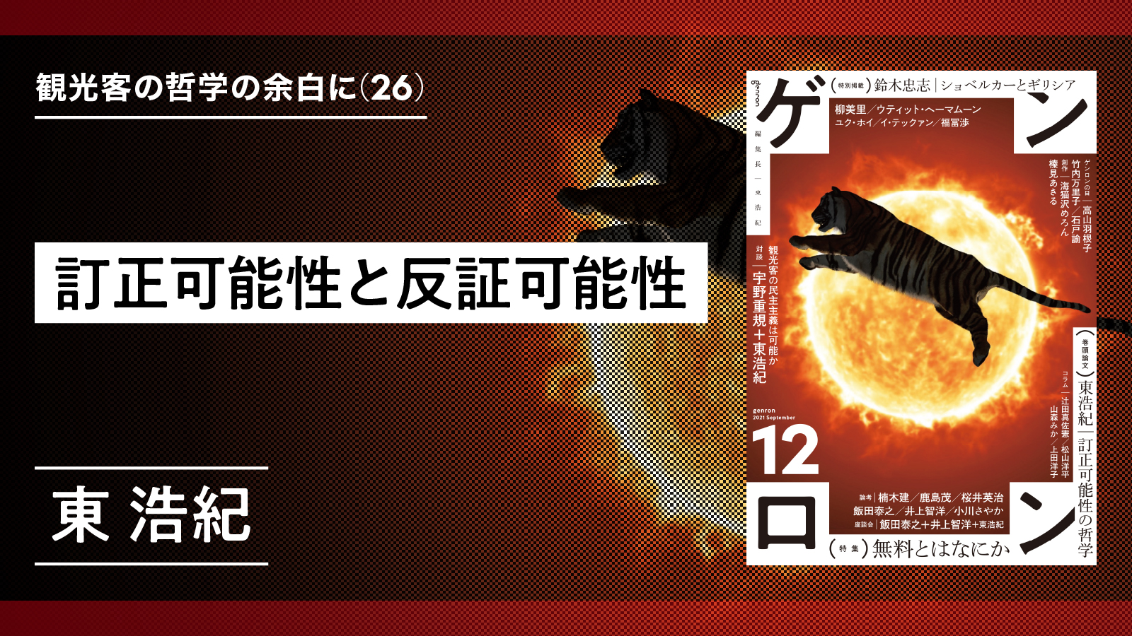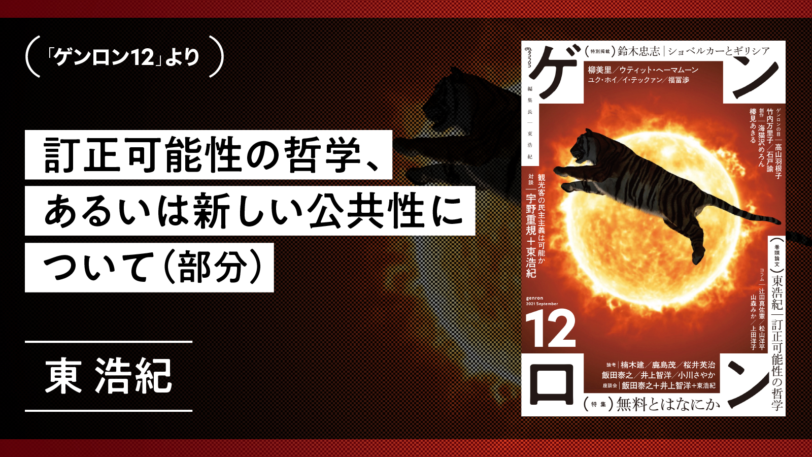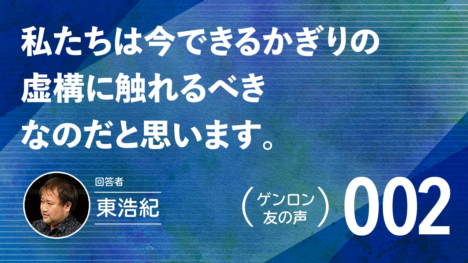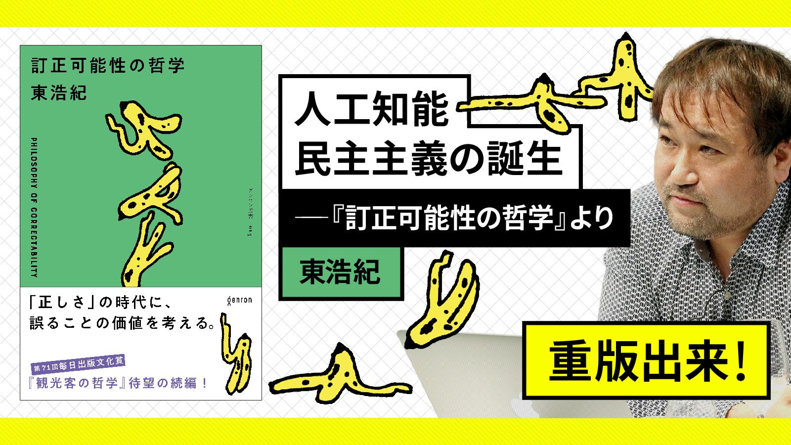 1971年東京生まれ。批評家・作家。東京大学大学院博士課程修了。博士(学術)。株式会社ゲンロン創業者。著書に『存在論的、郵便的』(第21回サントリー学芸賞)、『動物化するポストモダン』、『クォンタム・ファミリーズ』(第23回三島由紀夫賞)、『一般意志2.0』、『弱いつながり』(紀伊國屋じんぶん大賞2015)、『観光客の哲学』(第71回毎日出版文化賞)、『ゲンロン戦記』、『訂正可能性の哲学』など。